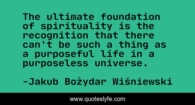 This page presents the quote "The ultimate foundation of spirituality is the recognition that there can't be such a thing as a purposeful life in a purposeless universe.". Author of this quote is Jakub Bożydar Wiśniewski. This quote is about spirituality, meaning-of-life, purpose-of-life, teleology,.