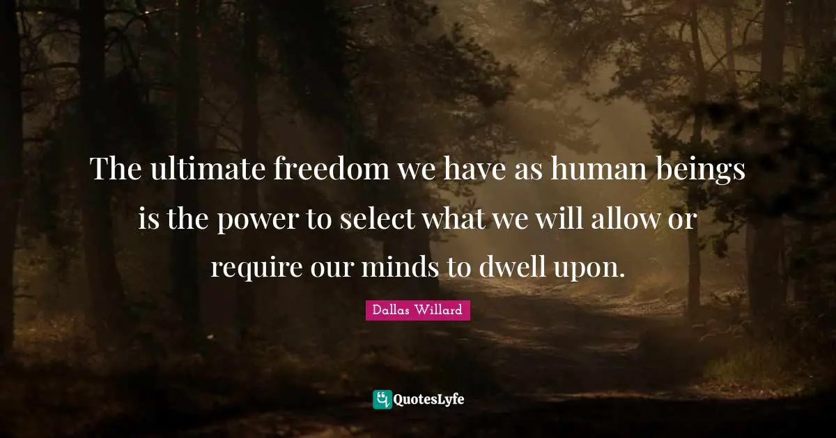 This page presents the quote "The ultimate freedom we have as human beings is the power to select what we will allow or require our minds to dwell upon.". Author of this quote is Dallas Willard. This quote is about ultimate freedom, human beings, mind, power, select,.