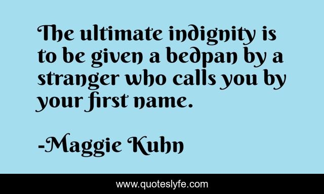 This page presents the quote "The ultimate indignity is to be given a bedpan by a stranger who calls you by your first name.". Author of this quote is Maggie Kuhn. This quote is about human, relations,.