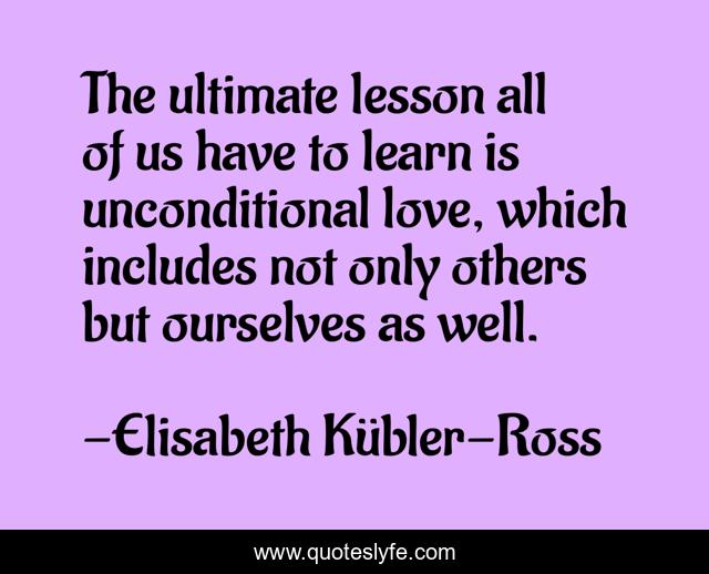 This page presents the quote "The ultimate lesson all of us have to learn is unconditional love, which includes not only others but ourselves as well.". Author of this quote is Elisabeth Kübler-Ross. This quote is about love, unconditional-love, affection, yourself,.