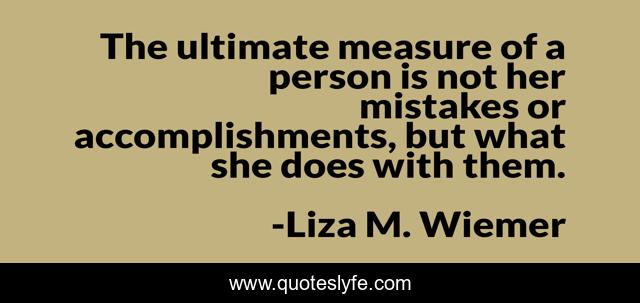 This page presents the quote "The ultimate measure of a person is not her mistakes or accomplishments, but what she does with them.". Author of this quote is Liza M. Wiemer. This quote is about mistakes, accomplishments, life-lessons, mistakes-forgiveness, life-philosophy, achievement,.