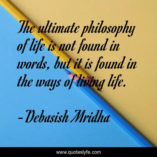 This page presents the quote "The ultimate philosophy of life is not found in words, but it is found in the ways of living life.". Author of this quote is Debasish Mridha. This quote is about philosophy, debasish-mridha, life-is-not-found-in-words, quotes, debasish-mridha-md, inspirational, enthusiasm, ultimate-philosophy, living-life,.