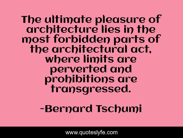 This page presents the quote "The ultimate pleasure of architecture lies in the most forbidden parts of the architectural act, where limits are perverted and prohibitions are transgressed.". Author of this quote is Bernard Tschumi. This quote is about pleasure, limits,.