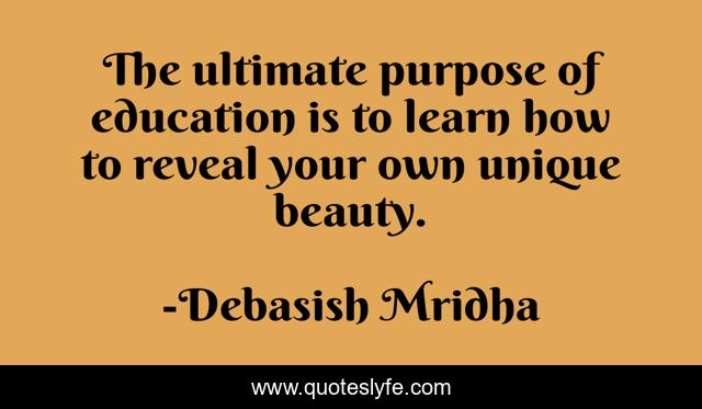 This page presents the quote "The ultimate purpose of education is to learn how to reveal your own unique beauty.". Author of this quote is Debasish Mridha. This quote is about miraboli, oscar-wilde, philosophy, debasish-mridha, purpose-of-education, tagore, quotes, unique-beauty, buddha,.