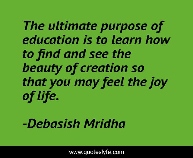 This page presents the quote "The ultimate purpose of education is to learn how to find and see the beauty of creation so that you may feel the joy of life.". Author of this quote is Debasish Mridha. This quote is about philosophy, debasish-mridha, purpose-of-education, joy-of-life, quotes, inspirational, enthusiasm, education, debasish-mridha-m-d,.