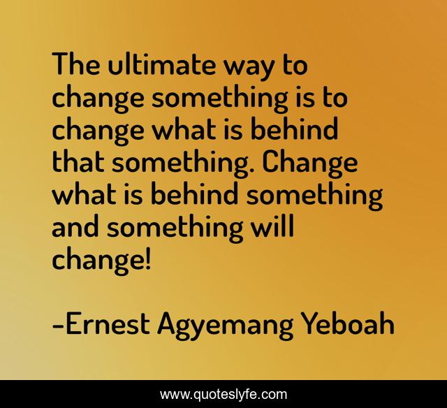 This page presents the quote "The ultimate way to change something is to change what is behind that something. Change what is behind something and something will change!". Author of this quote is Ernest Agyemang Yeboah. This quote is about thought, food-for-thought, change-something, change-your-attitude, wise-words, behaviour, attitude, attitude-toward-life, life-and-living,.
