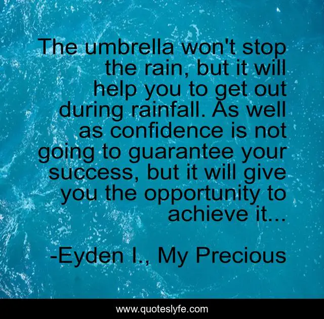 This page presents the quote "The umbrella won't stop the rain, but it will help you to get out during rainfall. As well as confidence is not going to guarantee your success, but it will give you the opportunity to achieve it...". Author of this quote is Eyden I., My Precious. This quote is about rainfall, life, umbrella, help, success, confidence, rain, inspirational, enthusiasm,.