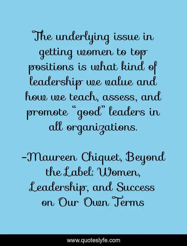 This page presents the quote "The underlying issue in getting women to top positions is what kind of leadership we value and how we teach, assess, and promote “good” leaders in all organizations.". Author of this quote is Maureen Chiquet, Beyond the Label: Women, Leadership, and Success on Our Own Terms. This quote is about women-empowerment, leadership, women-s-inspirational, women-leadership,.