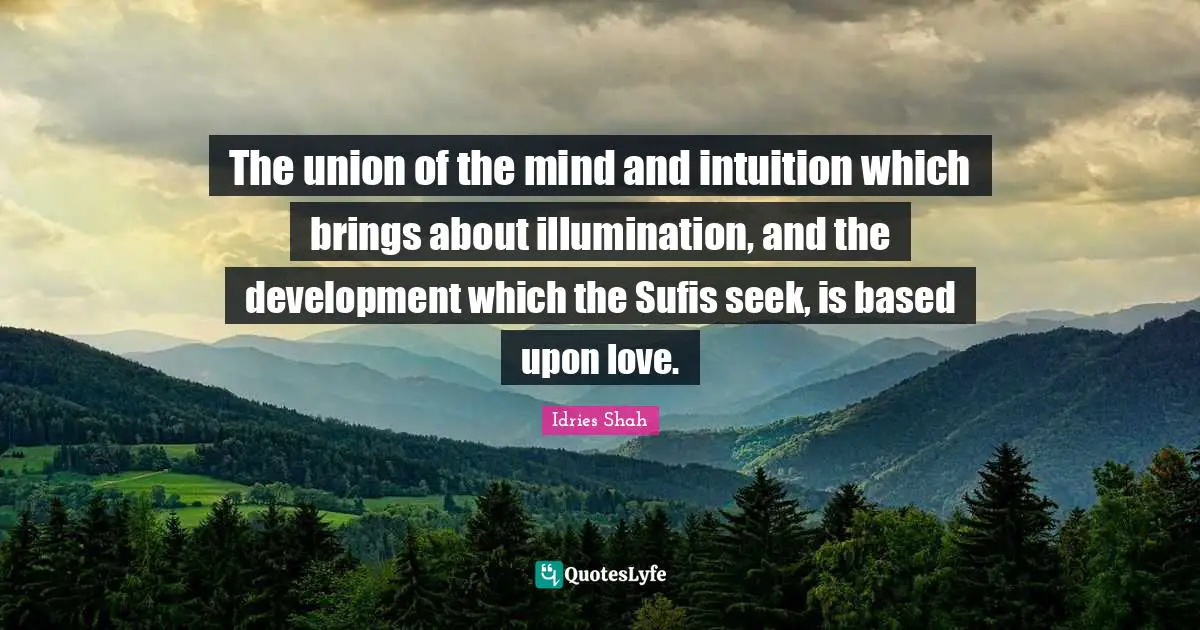 This page presents the quote "The union of the mind and intuition which brings about illumination, and the development which the Sufis seek, is based upon love.". Author of this quote is Idries Shah. This quote is about sufism, love, llumination, affection,.
