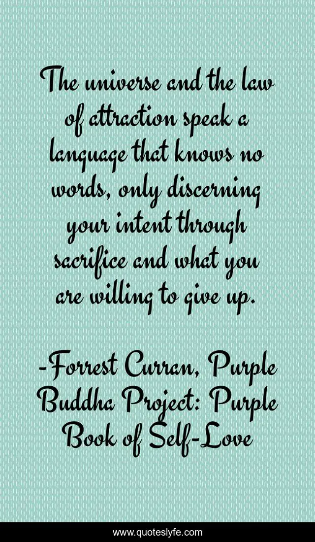 This page presents the quote "The universe and the law of attraction speak a language that knows no words, only discerning your intent through sacrifice and what you are willing to give up.". Author of this quote is Forrest Curran, Purple Buddha Project: Purple Book of Self-Love. This quote is about spiritual, peace, positive, motivational, zen, confidence, wisdom, optimistic, inspirational,.