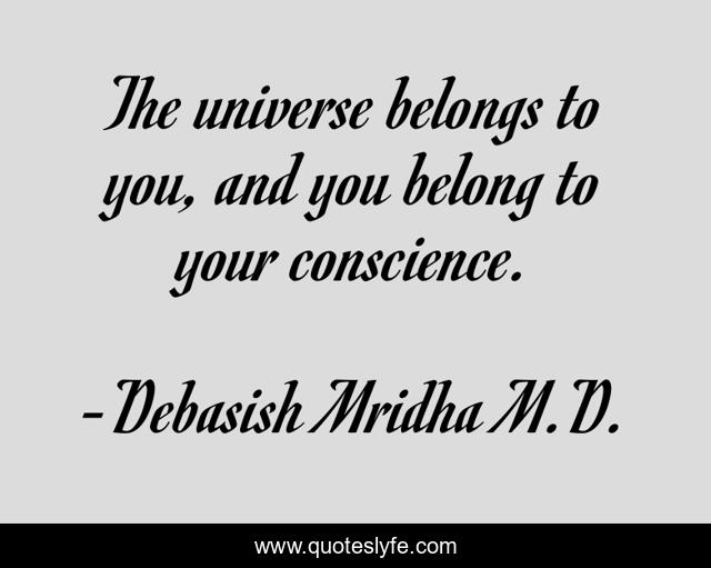 This page presents the quote "The universe belongs to you, and you belong to your conscience.". Author of this quote is Debasish Mridha M.D.. This quote is about conscience, the-universe-belongs-to-you, universe, philosophy, debasish-mridha, quotes, inspirational, enthusiasm, debasish-mridha-m-d,.