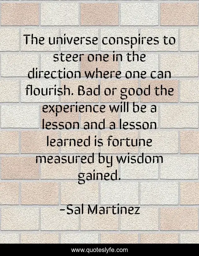 This page presents the quote "The universe conspires to steer one in the direction where one can flourish. Bad or good the experience will be a lesson and a lesson learned is fortune measured by wisdom gained.". Author of this quote is Sal Martinez. This quote is about experiences, universe, buddha-nature, fortune, wisdom,.