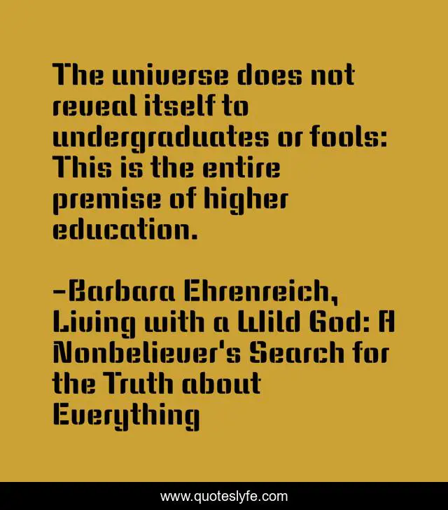 This page presents the quote "The universe does not reveal itself to undergraduates or fools: This is the entire premise of higher education.". Author of this quote is Barbara Ehrenreich, Living with a Wild God: A Nonbeliever's Search for the Truth about Everything. This quote is about universe, enlightenment, education,.