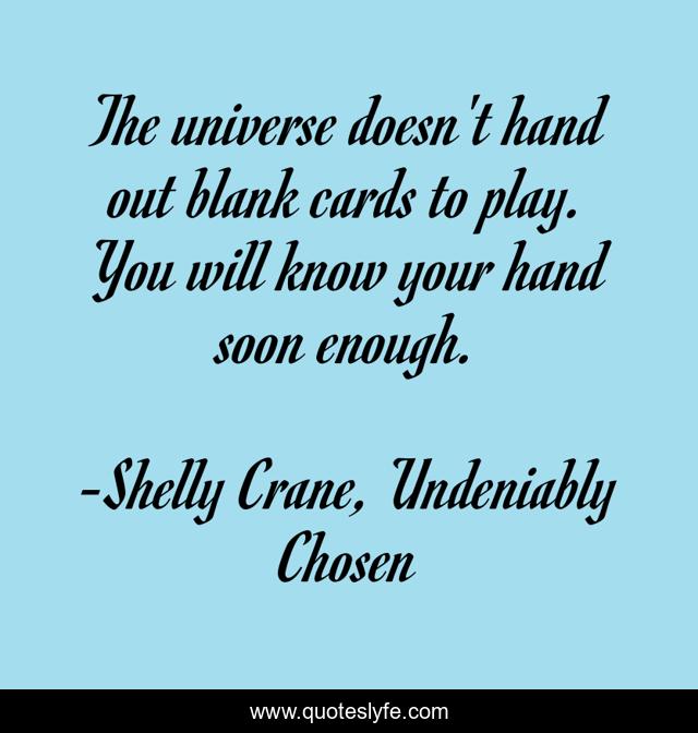 This page presents the quote "The universe doesn't hand out blank cards to play. You will know your hand soon enough.". Author of this quote is Shelly Crane, Undeniably Chosen. This quote is about soulmates, fate, significance,.