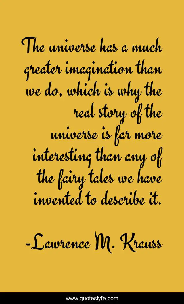 This page presents the quote "The universe has a much greater imagination than we do, which is why the real story of the universe is far more interesting than any of the fairy tales we have invented to describe it.". Author of this quote is Lawrence M. Krauss. This quote is about science, imagination, universe,.