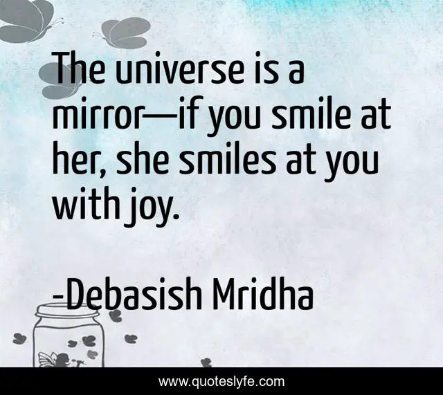 This page presents the quote "The universe is a mirror—if you smile at her, she smiles at you with joy.". Author of this quote is Debasish Mridha. This quote is about power-of-a-smile, universe, philosophy, debasish-mridha, quotes, inspirational, smile, enthusiasm, debasish-mridha-m-d,.