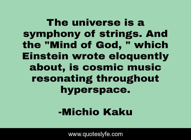 This page presents the quote "The universe is a symphony of strings. And the "Mind of God, " which Einstein wrote eloquently about, is cosmic music resonating throughout hyperspace.". Author of this quote is Michio Kaku. This quote is about cosmic-music, mind-of-god, hyperspace, universe,.