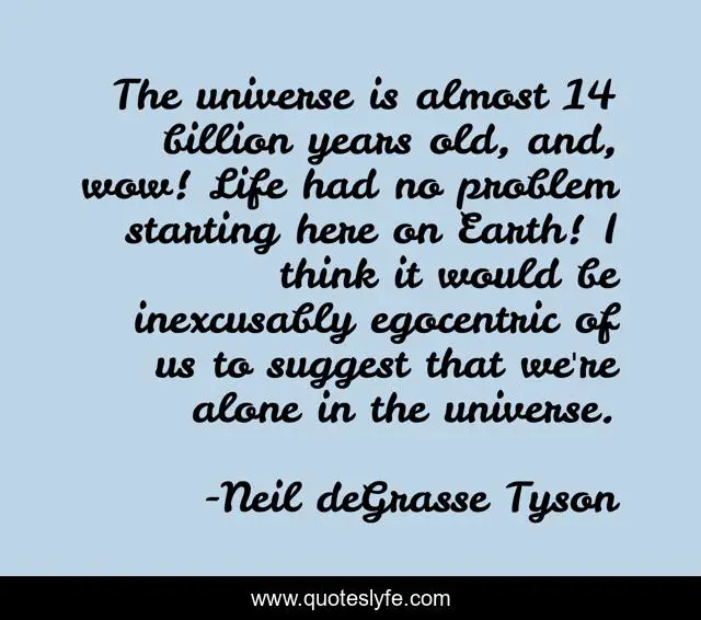 This page presents the quote "The universe is almost 14 billion years old, and, wow! Life had no problem starting here on Earth! I think it would be inexcusably egocentric of us to suggest that we're alone in the universe.". Author of this quote is Neil deGrasse Tyson. This quote is about universe, life, problem,.