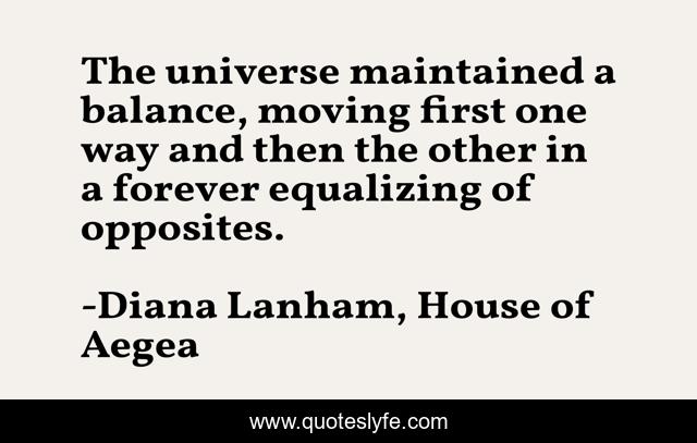 This page presents the quote "The universe maintained a balance, moving first one way and then the other in a forever equalizing of opposites.". Author of this quote is Diana Lanham, House of Aegea. This quote is about universe, balance, opposites,.