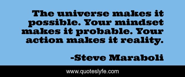 This page presents the quote "The universe makes it possible. Your mindset makes it probable. Your action makes it reality.". Author of this quote is Steve Maraboli. This quote is about motivation, dreams, goals, success, reality,.