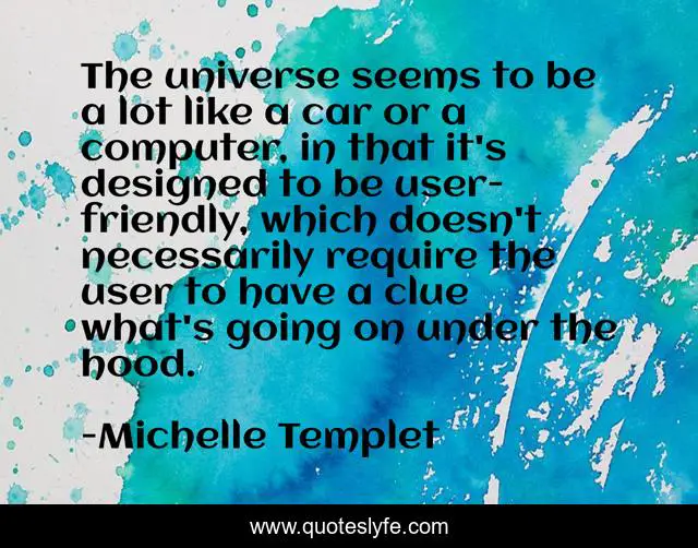 This page presents the quote "The universe seems to be a lot like a car or a computer, in that it's designed to be user-friendly, which doesn't necessarily require the user to have a clue what's going on under the hood.". Author of this quote is Michelle Templet. This quote is about science, philosophy, satire,.