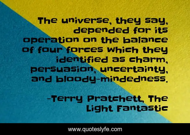 This page presents the quote "The universe, they say, depended for its operation on the balance of four forces which they identified as charm, persuasion, uncertainty, and bloody-mindedness.". Author of this quote is Terry Pratchett, The Light Fantastic. This quote is about universe, balance, pratchett, forces, world,.