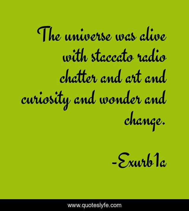 This page presents the quote "The universe was alive with staccato radio chatter and art and curiosity and wonder and change.". Author of this quote is Exurb1a. This quote is about universe, philosophy,.