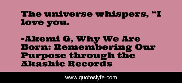 This page presents the quote "The universe whispers, “I love you.". Author of this quote is Akemi G, Why We Are Born: Remembering Our Purpose through the Akashic Records. This quote is about universe, unconditional-love,.