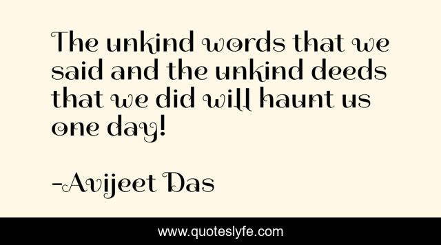 This page presents the quote "The unkind words that we said and the unkind deeds that we did will haunt us one day!". Author of this quote is Avijeet Das. This quote is about life, writers-life, unkind-words, haunt, unkindness, writers, writers-on-writing,.