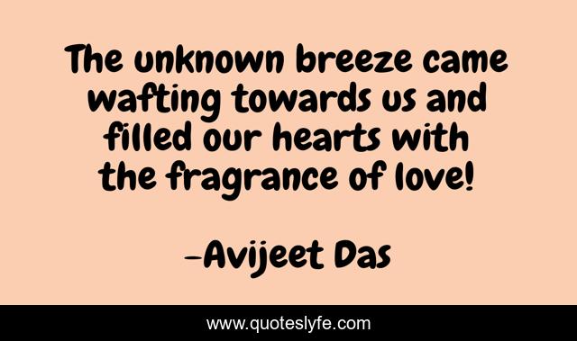 This page presents the quote "The unknown breeze came wafting towards us and filled our hearts with the fragrance of love!". Author of this quote is Avijeet Das. This quote is about life, love, breeze, fragrance, hearts, affection,.