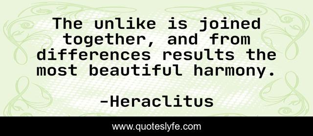 This page presents the quote "The unlike is joined together, and from differences results the most beautiful harmony.". Author of this quote is Heraclitus. This quote is about process, creativity,.