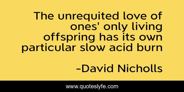 This page presents the quote "The unrequited love of ones' only living offspring has its own particular slow acid burn". Author of this quote is David Nicholls. This quote is about unrequited-love, father-and-son,.