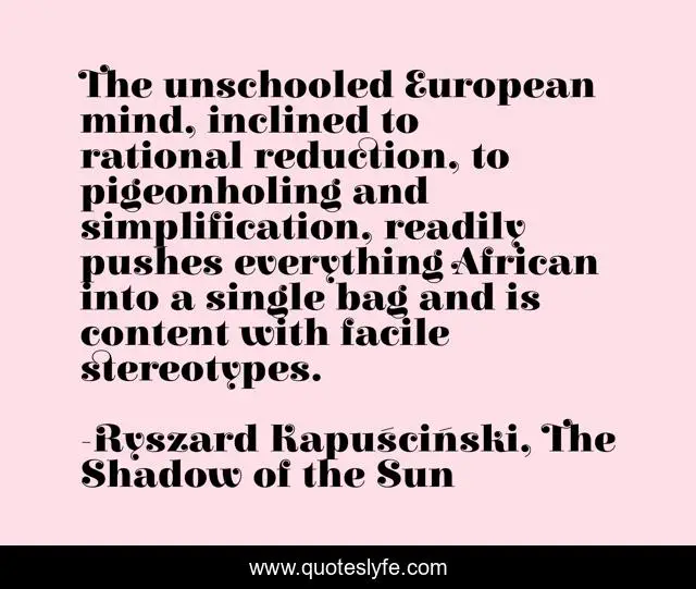 This page presents the quote "The unschooled European mind, inclined to rational reduction, to pigeonholing and simplification, readily pushes everything African into a single bag and is content with facile stereotypes.". Author of this quote is Ryszard Kapuściński, The Shadow of the Sun. This quote is about cultural, africa, steretoypes,.