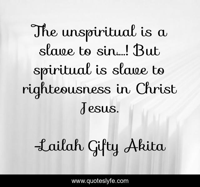 This page presents the quote "The unspiritual is a slave to sin.…! But spiritual is slave to righteousness in Christ Jesus.". Author of this quote is Lailah Gifty Akita. This quote is about jesus-christ, spiritual, christian, repentance, christianity, dont-quit, inspirng, theology, unspiritual,.