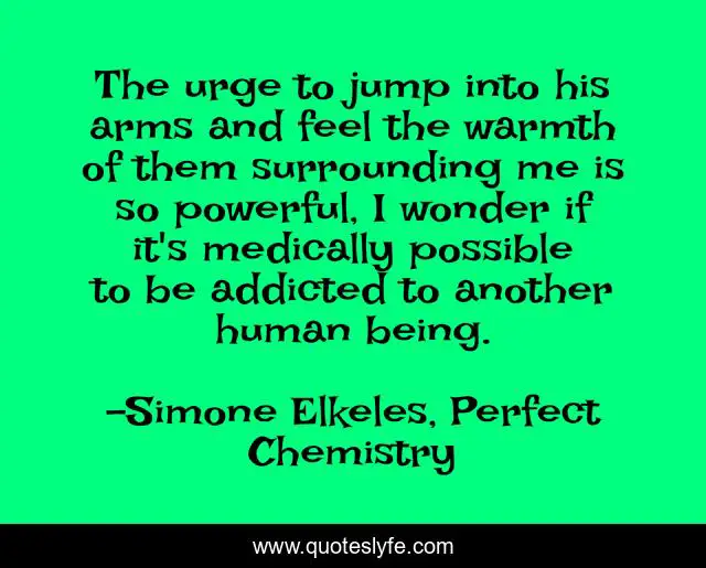 This page presents the quote "The urge to jump into his arms and feel the warmth of them surrounding me is so powerful, I wonder if it's medically possible to be addicted to another human being.". Author of this quote is Simone Elkeles, Perfect Chemistry. This quote is about cute, love, affection,.
