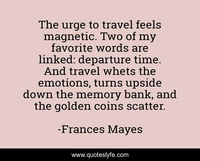 This page presents the quote "The urge to travel feels magnetic. Two of my favorite words are linked: departure time. And travel whets the emotions, turns upside down the memory bank, and the golden coins scatter.". Author of this quote is Frances Mayes. This quote is about travel, travel-writing,.