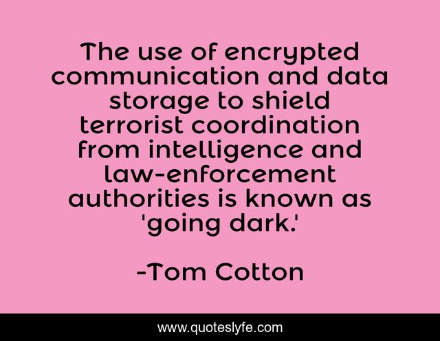 This page presents the quote "The use of encrypted communication and data storage to shield terrorist coordination from intelligence and law-enforcement authorities is known as 'going dark.'". Author of this quote is Tom Cotton. This quote is about dark, intelligence, data,.