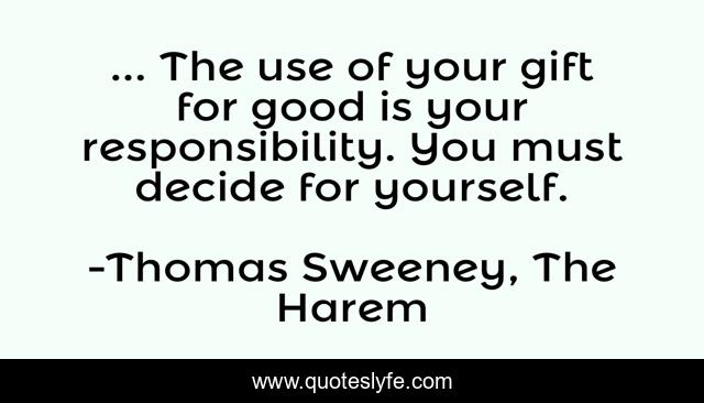 This page presents the quote "... The use of your gift for good is your responsibility. You must decide for yourself.". Author of this quote is Thomas Sweeney, The Harem. This quote is about drama, romance-novel, energy, the-harem, contemporary, fiction, romance, erotic, dramatic,.