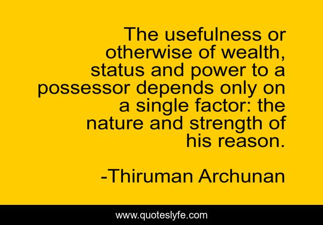 This page presents the quote "The usefulness or otherwise of wealth, status and power to a possessor depends only on a single factor: the nature and strength of his reason.". Author of this quote is Thiruman Archunan. This quote is about status, reason, wealth, power,.