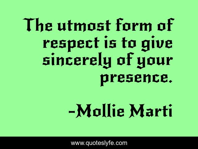 This page presents the quote "The utmost form of respect is to give sincerely of your presence.". Author of this quote is Mollie Marti. This quote is about body-language, kindness, purpose, servant-leader,.
