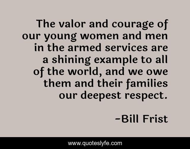 This page presents the quote "The valor and courage of our young women and men in the armed services are a shining example to all of the world, and we owe them and their families our deepest respect.". Author of this quote is Bill Frist. This quote is about world, courage, women,.