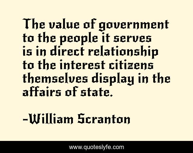This page presents the quote "The value of government to the people it serves is in direct relationship to the interest citizens themselves display in the affairs of state.". Author of this quote is William Scranton. This quote is about government, value, people,.