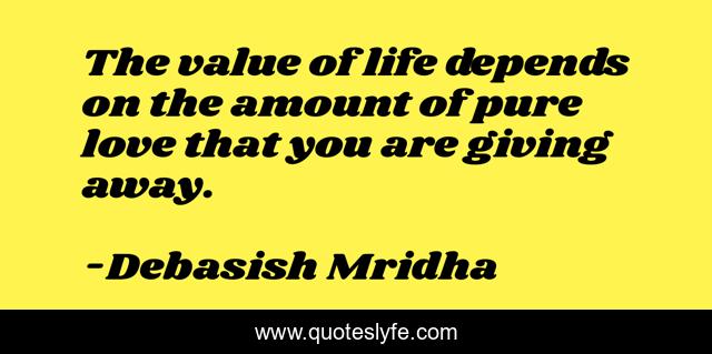 This page presents the quote "The value of life depends on the amount of pure love that you are giving away.". Author of this quote is Debasish Mridha. This quote is about love-that-you-give-away, love, inspirational, philosophy, debasish-mridha, quotes, value-of-life, pure-love, enthusiasm,.