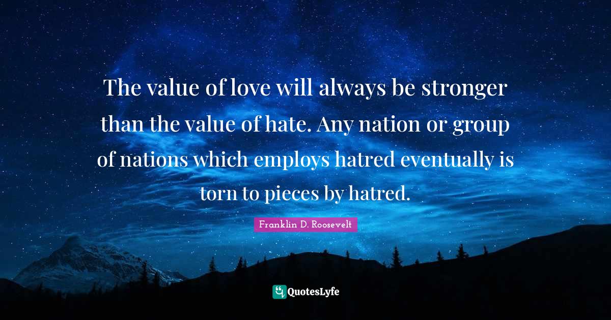 This page presents the quote "The value of love will always be stronger than the value of hate. Any nation or group of nations which employs hatred eventually is torn to pieces by hatred.". Author of this quote is Franklin D. Roosevelt. This quote is about love, couple, nations, torn, stronger, marriage, pieces, hate, value of love,.