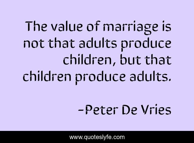 This page presents the quote "The value of marriage is not that adults produce children, but that children produce adults.". Author of this quote is Peter De Vries. This quote is about aging, adults, maturity, parenting, marriage, children,.