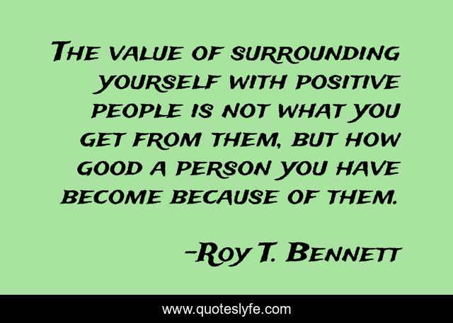 This page presents the quote "The value of surrounding yourself with positive people is not what you get from them, but how good a person you have become because of them.". Author of this quote is Roy T. Bennett. This quote is about living, inspiring, inspire, inspiration, positive, positive-affirmation, motivational, life, confidence,.