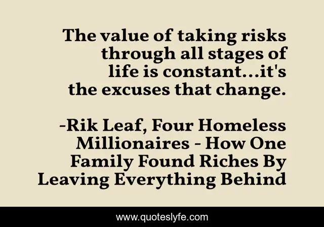 "Rik Leaf, Four Homeless Millionaires - How One Family Found Riches By Leaving Everything Behind Quotes." Quoteslyfe.com, 2025. Fri. 05 Dec. 2025. <https://www.quoteslyfe.com/quote/The-value-of-taking-risks-through-all-151917>.