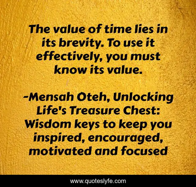 "Mensah Oteh, Unlocking Life's Treasure Chest: Wisdom keys to keep you inspired, encouraged, motivated and focused Quotes." Quoteslyfe.com, 2025. Fri. 05 Dec. 2025. <https://www.quoteslyfe.com/quote/The-value-of-time-lies-in-its-48942>.