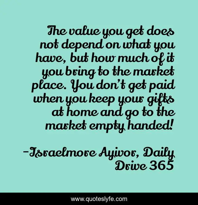 This page presents the quote "The value you get does not depend on what you have, but how much of it you bring to the market place. You don’t get paid when you keep your gifts at home and go to the market empty handed!". Author of this quote is Israelmore Ayivor, Daily Drive 365. This quote is about sell, loss, food-for-thought, selling, success, profit, marketing, profit-and-loss, value,.