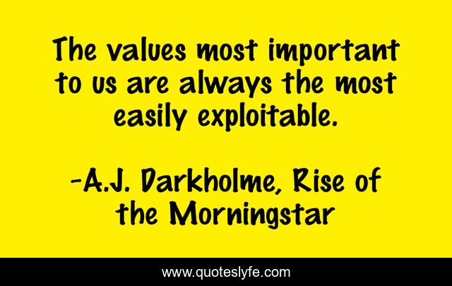 This page presents the quote "The values most important to us are always the most easily exploitable.". Author of this quote is A.J. Darkholme, Rise of the Morningstar. This quote is about love, morals, people, manipulation, caution, exploitable, emotions, persuasion, awareness,.